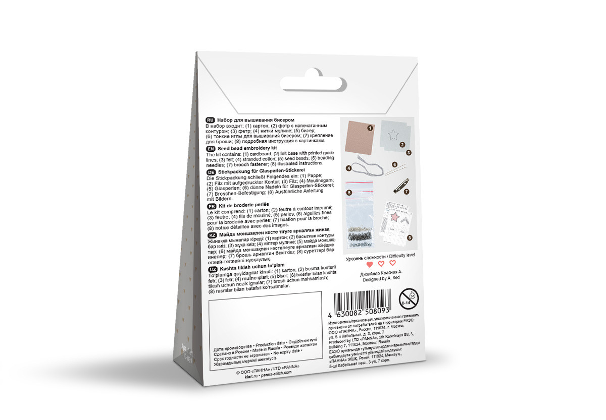 В набор для вышивания Klart входит: картон, фетр с напечатанным контуром, фетр, хлопчатобумажные нитки мулине Gamma, бисер, тонкая игла для вышивания бисером Gamma, замок для броши, подробная инструкция с цветными иллюстрациями. Сообщить о неточности в описании