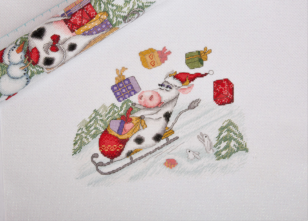 В набор для вышивания Klart входит: канва К04L с люрексом Aida №14 Gamma, хлопчатобумажные нитки мулине Gamma на держателе, игла для вышивания Gamma, схема и подробная инструкция по вышиванию. Вышивка с новогодним сюжетом станет отличным подарком на праздник и чудесным украшением дома к Новому году.   Корова – символ плодородия, благосостояния и здоровья.